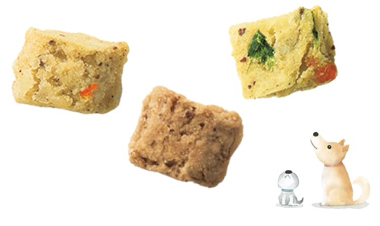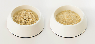普通のドライフードは水を吸うと膨らんでしまいますが私たちのフードは油でコーティングしていないため、ふやかすと半生フード風に、潰すとスープ仕立て風になってとても食べやすくなります。